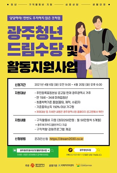 접수는 광주청년드림 공식사이트에서 온라인으로 할 수 있으며, 광주시는 지원 대상자의 가구 소득, 미취업기간, 구직활동계획서를 심사해 최종 선발할 계획이다.