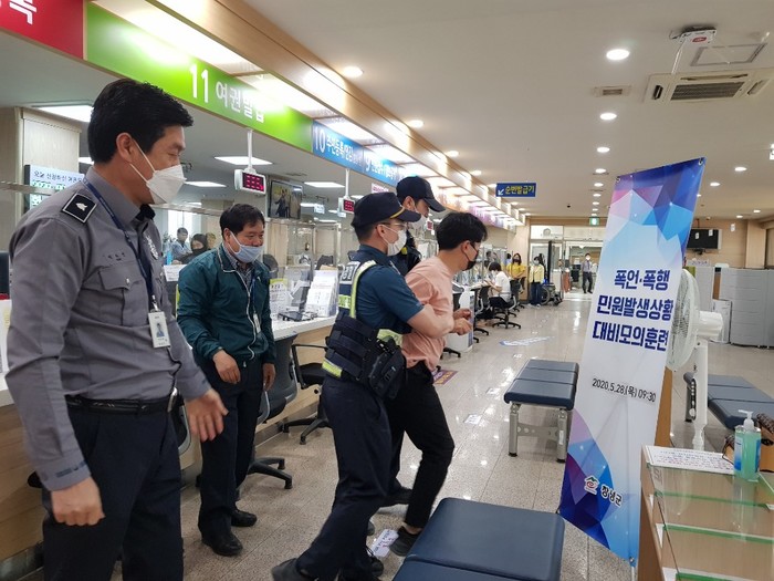 창녕군(군수 한정우)은 지난 28일 군청 종합민원실에서 민원공무원, 경찰, 청원경찰 등 20명이 참석한 가운데 폭언.폭행 등 특이민원을 가상한 비상상황 발생 대비 모의훈련을 실시했다고 밝혔다.