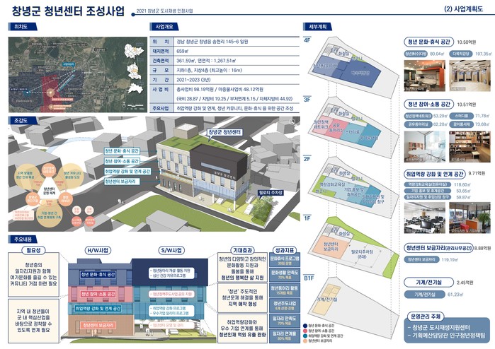 군은 이번 사업을 통해 ‘(가칭)창녕군 청년센터’를 건립해 지역 청년들이 정착할 수 있도록 지역 맞춤형 청년 인재를 육성하고 일자리 창출과 더불어 청년 커뮤니티 활성화 공간으로 활용할 계획이다
