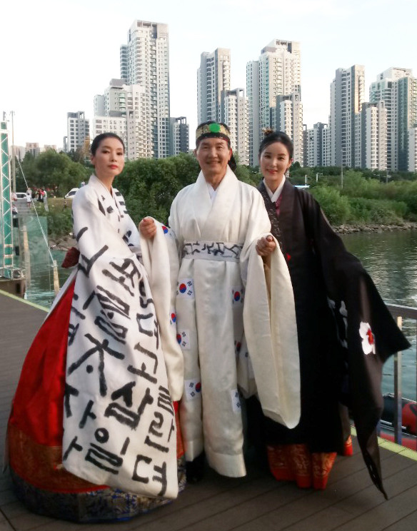 [시민일보 = 유만옥 기자] 3.1운동 100주년을 맞아 최근 '2019 서울스토리패션쇼'가 새빛섬에서 막을 올렸다. 사진은 한복디자이너 이순화 선생의 한복패션쇼에서 슈퍼모델 김효진, 배우 김성희, 시니어 모델 소남섭 회장이 포즈를 취하는 모습.