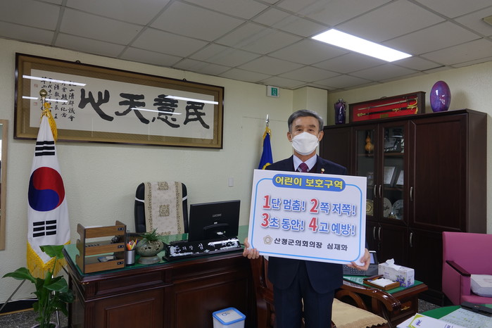 심재화 산청군의회의장은 9일 어린이 보호구역 내 교통안전 문화 정착을 위한 ‘어린이 교통안전 릴레이 챌린지’에 동참했다.