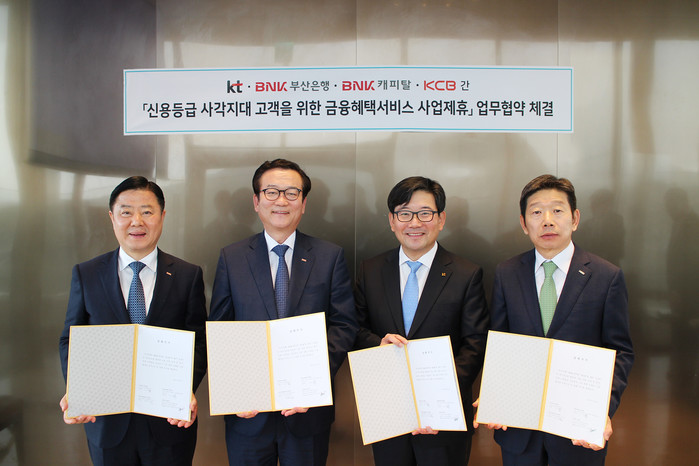 부산은행과 BNK캐피탈은 지난 22일 오후, KT, 코리아크레딧뷰로(KCB)와 ‘신용등급 사각지대 고객을 위한 금융혜택서비스 사업 제휴 업무 협약(MOU)’을 체결했다.