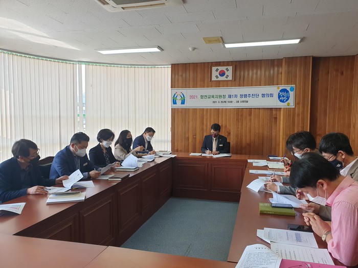 합천교육지원청(교육장 정종화)은 청렴수준을 높여 신뢰받는 합천교육을 구현하기 위해 3월 25일 오전 2층 소회의실에서 교육장 주재로 교육지원과장, 행정지원과장 및 부패취약분야별 팀장과 장학사들로 구성된「2021년도 제1차 청렴추진단 협의회」를 개최하였다