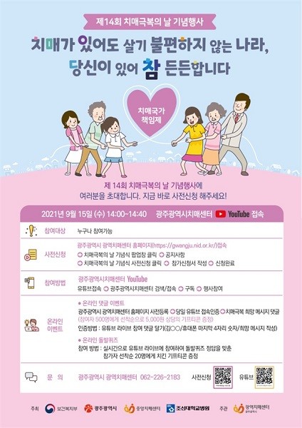 광주시가 주최하고 광주시 광역치매센터가 주관하는 이번 행사는 ‘치매가 있어도 살기 불편하지 않는 나라, 당신이 있어 참 든든합니다’를 주제로, 코로나19 상황을 고려해 치매 유관기관 종사자 및 치매 가족, 시민이 비대면으로 참여할 수 있는 온라인 유튜브 방송(광주시 광역치매센터)으로 진행된다.