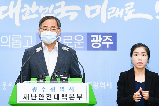 | ▲ 이삼용 코로나19 민관공동대책위원회 공동위원장이 22일 오전 시청 브리핑룸에서 사회적거리두기 2단계 격상 등 민관공동대책위원회 회의 결과를 발표하고 있다./광주광역시 제공 |
