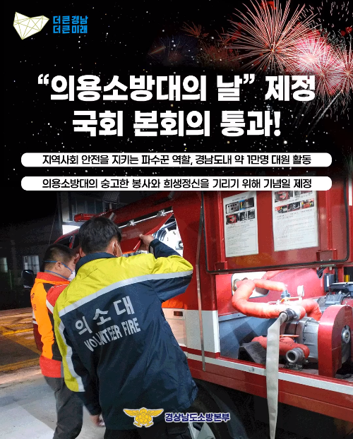 합천소방서(서장 김진옥)는“의용소방대의 봉사와 희생정신을 기리기 위한 ‘의용소방대의 날’ 지정을 골자로 하는 「의용소방대 설치 및 운영에 관한 법률*」개정안이 3월 24일 국회 본회의를 통과하였다.”고 밝혔다. * 이재정 의원 대표발의(2020. 8. 31.)