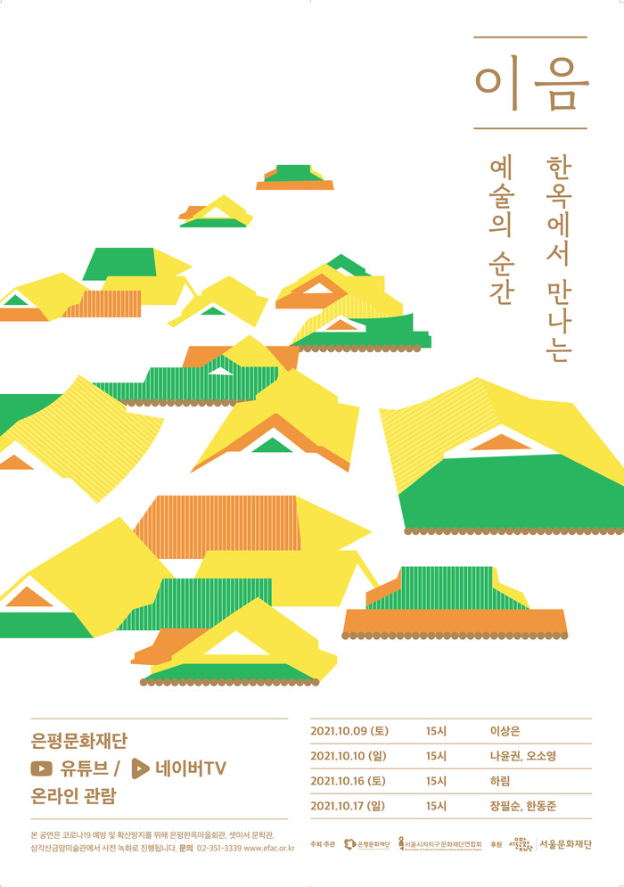 장필순, 한동준, 이상은, 하림, 나윤권, 오소영 등 음악을 통해 마음을 잇고 힐링의 시간을 더해줄 비대면 공연 ‘이음’은 2021 서울시 자치구 문화예술 콘텐츠 특성화 사업으로 선보이는 기획프로그램이다.