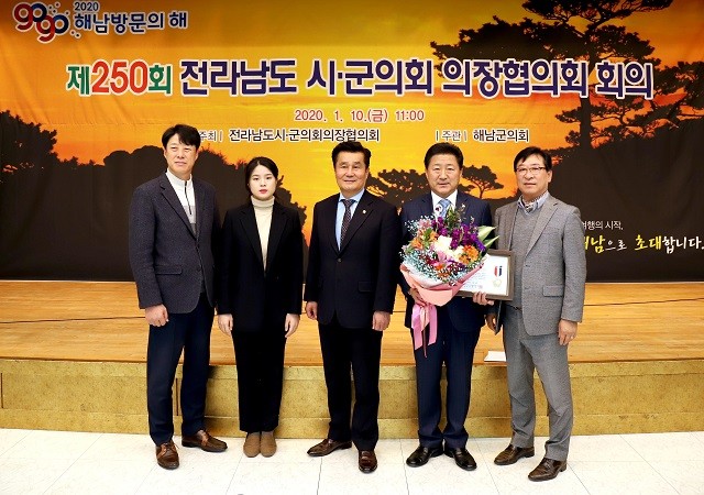 | 조정기 영암군의회 의장(우측부터 두 번째), 지난 10일 전국 시·군자치구의회의장협의회에서 수여하는 '2019년도 지방의정봉사상' 수상 기념촬영 / 영암군의회 제공 |