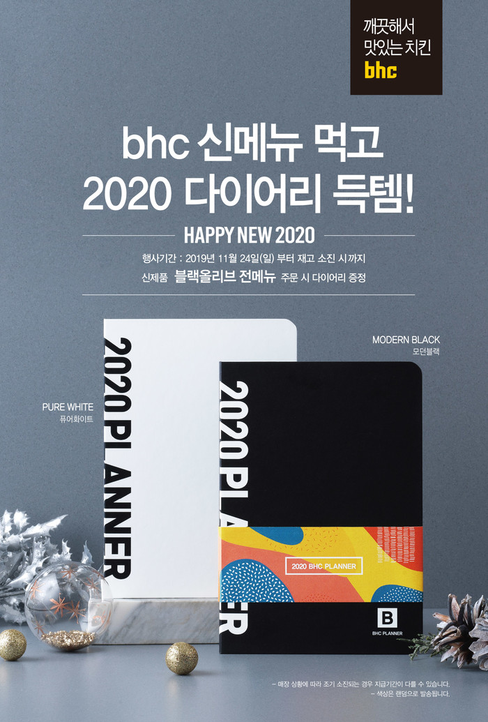 치킨 프랜차이즈 bhc치킨은 지난 11월 말 모던함을 강조한 '2020 다이어리'를 선보이고 '블랙올리브' 치킨을 주문하는 고객을 대상으로 무료 증정 이벤트를 펼치고 있다고 밝혔다.
