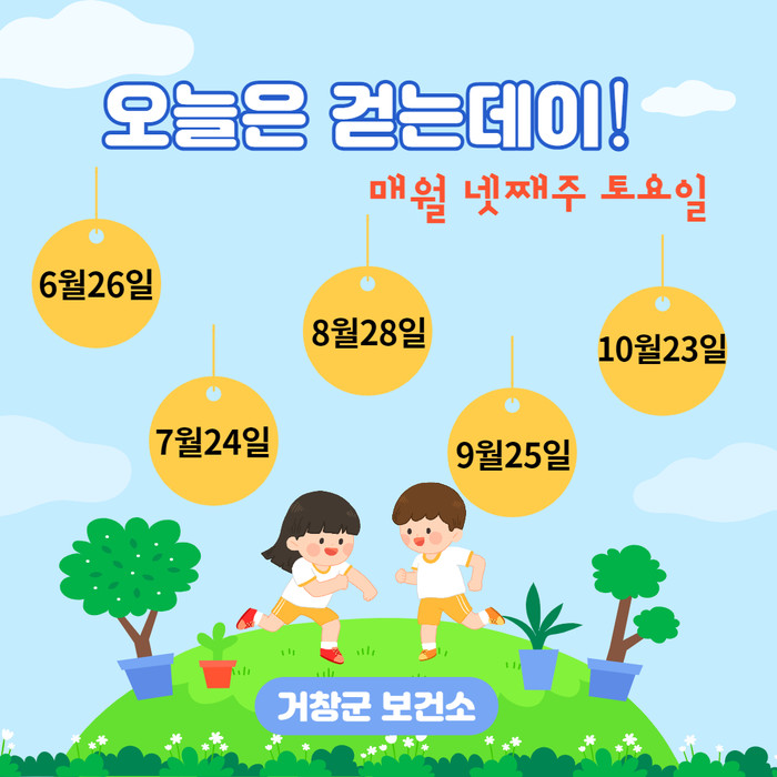 거창군은 코로나19 장기화로 제한된 일상 속에 혼자서도 실천 가능한 걷기 운동을 독려하기 위해 매월 넷째 주 토요일을 ‘걷는 데이(day)’로 지정해 캠페인을 운영한다.