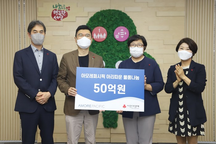 그룹은 최근 코로나19로 지역사회와 복지시설 위생에 관심이 높은 만큼 지난해 상반기 진행한 아리따운 물품나눔의 2.5배, 소비자가 50억원 규모로 화장품과 생활용품 등을 사회복지시설에 지원했다.