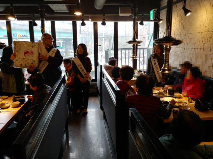 이날 고양시 원당종합사회복지관도 식사 대접에 참여하여 전기장판 30장을 협찬했다. 전기장판은 식사 장소에 오신 어르신들에게 전달됐다.