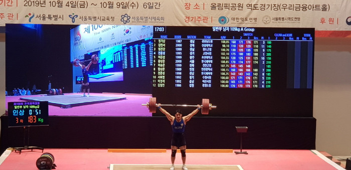 진윤성 선수(109㎏)는 9월 태국에서 열린 세계선수권대회 1위(인상)의 기세를 이어 12명의 출전 선수 가운데 유일하게 인상 3차시기(175-180-183㎏)를 모두 성공시키며 금메달을 확정했다.