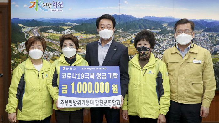 합천군(군수 문준희)은 주부민방위기동대 합천군연합회(회장 장외자)가 지난 25일 합천군청을 방문해 코로나 19로 어려움을 겪고 있는 군민들을 위해 써달라며 100만원을 기탁했다고 밝혔다.