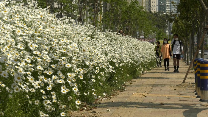 양산시가 부산대 유휴부지 경사면에 식재한 야생화 샤스타데이지가 개화해 시민들의 눈길을 사로잡고 있다.