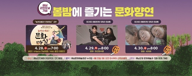 29일과 30일에는 해남군민광장 잔디광장에서 오후 8시부터 돗자리 영화제를 개최, 최신 한국영화 ‘미션 파서블’과 ‘세자매’를 무료 상영한다. 1일 30석 총 60석만 선착순으로 신청받는다.