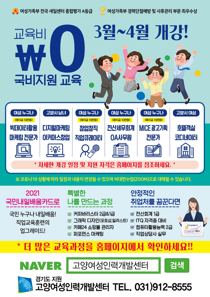 [고양=이기홍 기자] 고양시와 고양여성인력개발센터는 오는 30일부터 청년 및 여성의 취·창업 지원을 위한 2021년 국비지원 직업교육 훈련을 시작한다.