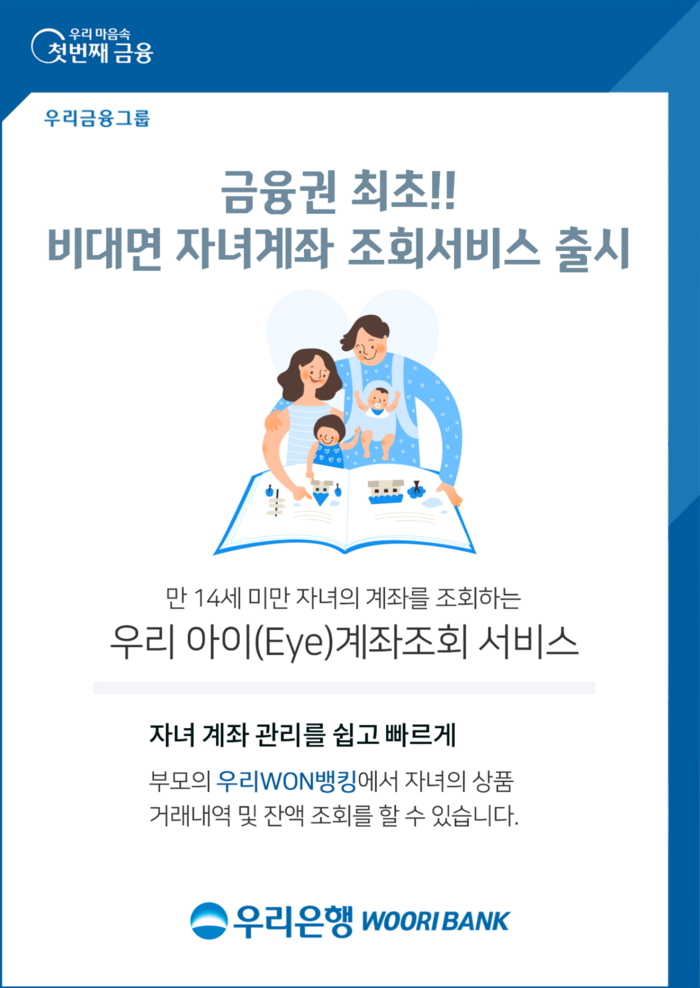 [시민일보 = 홍덕표 기자] 우리금융지주의 자회사 우리은행은 금융권 최초 비대면으로 부모가 자녀의 계좌를 조회할 수 있는 '우리 아이(Eye) 계좌조회 서비스'를 출시했다고 8일 밝혔다.