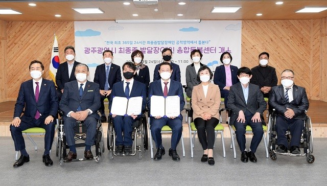광주광역시는 24일 오전 시 장애인종합복지관에서 이용섭 시장, 김용집 시의회 의장, 문인 북구청장, 김유선 장애인부모연대 대표 등이 참석한 가운데 최중증 발달장애인 융합돌봄센터 개소식을 개최했다.