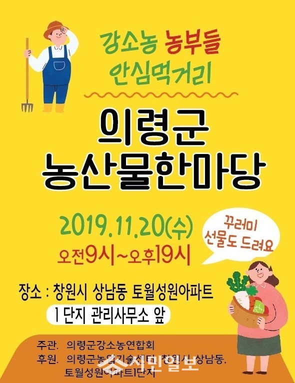 이날 개최되는 의령군 농산물 한마당은 의령군강소농연합회가 주관하고 의령군농업기술센터,창원시 상남동 토월성원아파트 1단지가 후원하는 행사다.