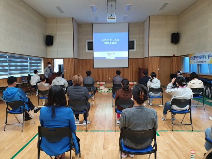 합천군(군수 문준희)은 10월 20일 종합사회복지관 별관 2층 다목적 강당에서 일반인, 공무원, 유치원 교사, 보건교사, 의료기관 종사자 등을 대상으로 심폐 소생술 등 응급처치 교육을 실시했다.이번 교육은 우리 사회에서 일어나는 각종 재난으로 인한 질병과 스트레스 응급환자 등이 급증하고 있는 상황에서 관리자 및 일반인이 위급상황에 대한 초기 대응능력을 키우고 응급환자의 소중한 생명을 살리기 위하여 작년에 이어 올해도 진행됐다. 경상대학교 응급의학과 전문의로부터 응급처치와 심폐소생술의 기본적인 내용과중요성 등에 대한 이론 교육 후 교육 참가자들의 심폐소생술과 자동심장충격기(AED)를 직접 실습해보는 시간을 가졌다.