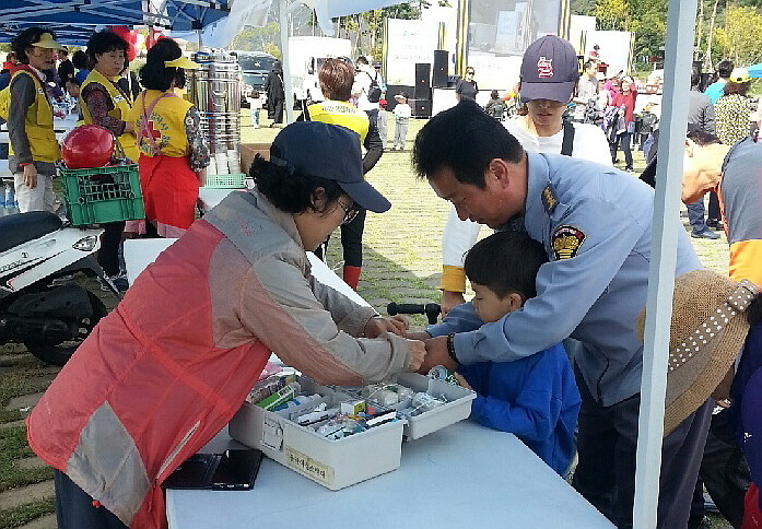 | 사진-물금의용소방대원이 행사 참여객에게 응급치료를 하는 모습 |