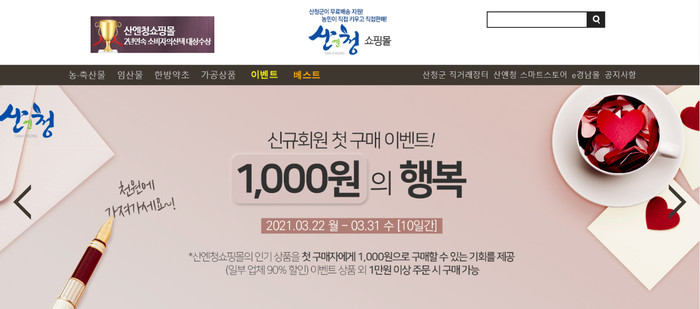 산청군 직영 농특산물 온라인쇼핑몰 ‘산엔청쇼핑몰이 오는 31일까지 ‘농업인 돕기 1000원의 행복’기획전을 진행한다.
