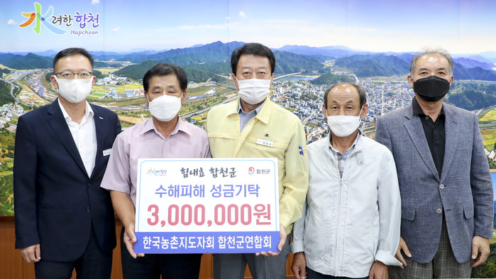 (사)한국농촌지도자 합천군연합회(회장 권태성)는 지난 1일 최근 집중호우 피해로 힘든 시기를 겪고 있는 수해민에 써달라며 합천군청을 방문해 성금 300만원을 기탁했다.