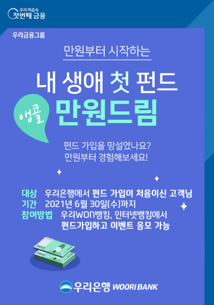 [시민일보 = 홍덕표 기자] 우리금융지주의 자회사 우리은행은 비대면으로 우리은행 펀드를 최초로 가입하는 고객을 대상으로 '앵콜! 만원부터 시작하는 내 생애 첫 펀드 만원드림' 이벤트를 오는 30일까지 진행한다고 밝혔다.
