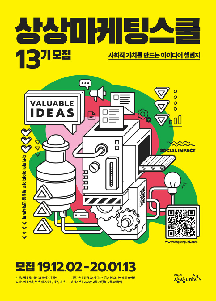[시민일보 = 홍덕표 기자] KT&G가 전국 대학생을 대상으로 마케팅 실전 사례를 경험하고 전문가들로부터 코칭을 받을 수 있는 '상상마케팅스쿨 13기' 참가자를 오는 2020년 1월13일까지 모집한다.