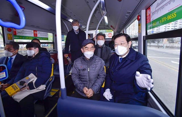 수소버스인 순환01번을 타고 시청까지 이동한 이용섭 시장은 시내버스를 이용한 시민들과 ▲에너지 자립도시 실현 ▲대중교통 이용 활성화 ▲코로나19 극복 등을 주제로 이야기를 나눴다.