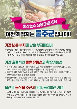 유치위원회는 가장 넓은 부지에 낮은 부지매입비, 가장 효율적인 물류 유통성과 확장가능성, 울산 시민 편의성과 지리적 중심지, 울산 농산물의 주산지 등의 최적지 조건을 내세우며, 울산 농수산물도매시장은 반드시 울주군에 유치되어야 한다고 밝혔다.