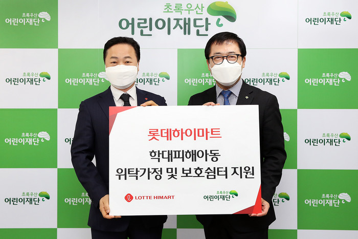 ▲ 학대피해아동 위탁가정 및 보호쉼터 지원금 전달식에서 롯데하이마트 박왕근 경영지원부문장(왼쪽)과 초록우산어린이재단 여승수 서울3지역본부장이 기념촬영을 하는 모습. (사진제공=롯데하이마트) |
