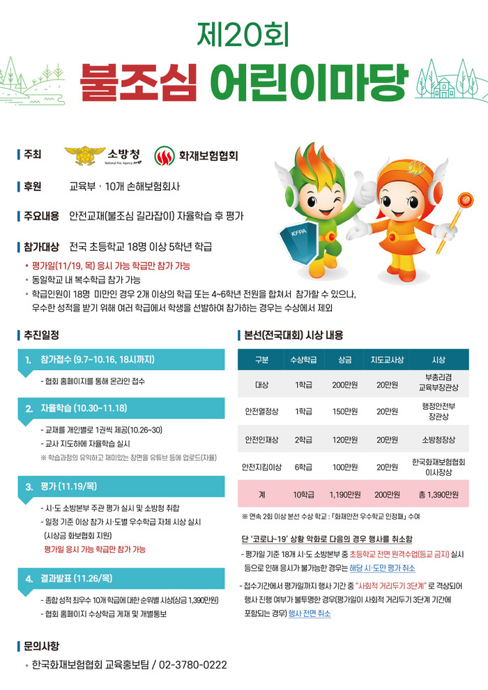 소방청과 한국화재보험협회가 주최하고 교육부, 10개 손해보험회사가 후원하는 이번 행사는 어린이에게 화재·자연재난·생활안전에 관한 기초지식을 알려 안전한 어린이를 육성하고 안전문화 확산에 기여하도록 하고자 마련됐다.