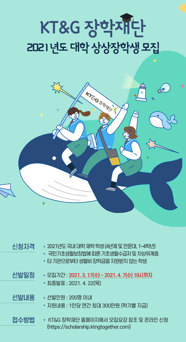 [시민일보 = 홍덕표 기자] KT&G장학재단이 저소득층 대학생을 대상으로 오는 4월7일까지 '2021 대학 상상장학생'을 모집한다.