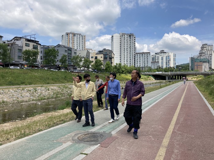 경기 남양주시 별내행정복지센터가 최근 하천 정원화 활동의 일환으로 여름철 우기를 대비한 용암·불암천 등 지역내 하천변 일대 로드체킹을 실시했다. 사진은 관계자들이 하천변을 체크하고 있는 모습. (사진제공=남양주시청)
