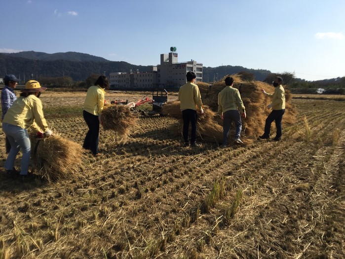 이날 내일동 직원 일동은 용평동에 거주하고 있는 농가의 논에서 볏단 옮기기 작업 등을 하며 부족한 일손을 거들었다.