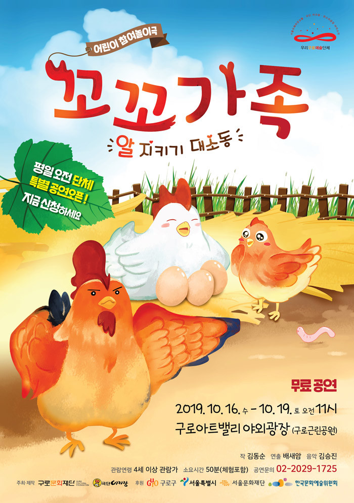 아이들의 신체 발달 및 정서에 도움을 주는 체험 활동과 작품 관람이 결합한 어린이 참여놀이극 <꼬꼬가족 : 알 지키기 대소동>은 10월 16일부터 19일까지 구로아트밸리 야외극장에서 펼쳐진다. 공연문의 02-2029-1725