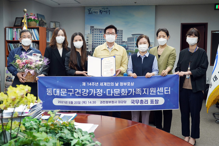 서울 동대문구건강가정·다문화가족지원센터가 최근 '제14주년 세계인의 날 정부포상' 외국인 주민의 지역사회 정착지원 및 사회통합에 공헌한 단체부문에서 국무총리 표창을 받았다. 사진은 유덕열 구청장(가운데)과 센터 관계자들이 기념촬영을 하고 있는 모습. (사진제공=동대문구청)