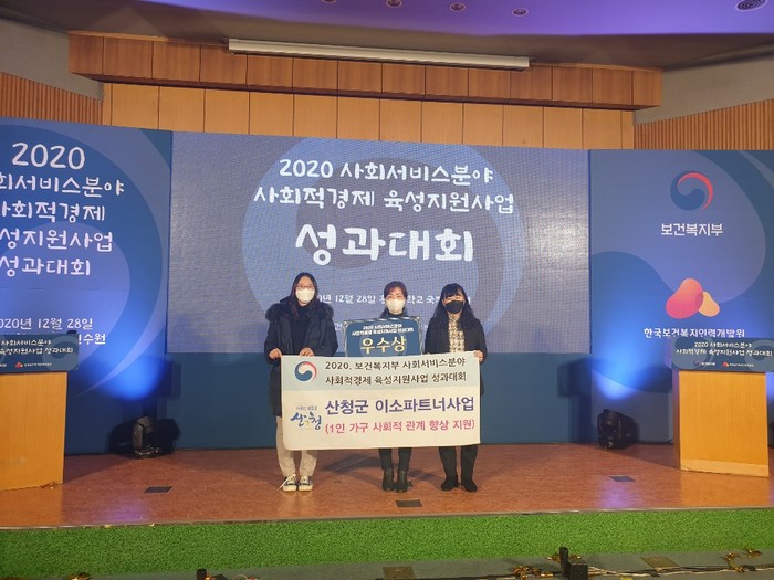 산청군은 1인 가구 수급자 비율이 높은 지역사회 문제를 해소하기 위한 세부적 계획수립과 국가 공적서비스 (지역사회서비스투자사업) 승인으로 지속 가능성 확보에 기여한 공로를 인정받았다.