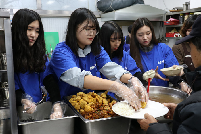 | ▲ 해바라기 봉사단 3기 2조 단원들이 배식 봉사를 하고 있다. (사진제공=bhc치킨) |