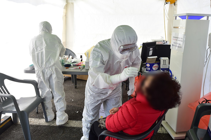 | ▲ 코로나19 의심 환자의 검체를 채취하고 있는 의료진들. (사진제공=진주시청) |