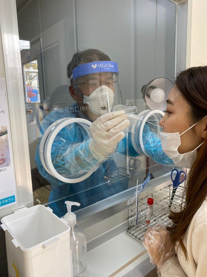 중앙에 아크릴 벽을 두어 의료진과 검사대상자의 공간을 분리하고 장갑이 달린 구멍을 통해 검체를 채취하도록 만든 '의료용 분리벽(글로브월)'은 의료진이 맞은편 검사대상자와 직접 접촉할 필요가 없어 검체채취시 감염을 예방하며 냉방 운영시에도 교차감염을 최소화할 수 있다.