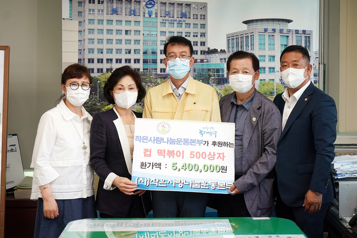 최근 (사)작은사랑나눔 운동본부와 한국주택금융공사 서울동부지사가 지역내 어려운 이웃들을 위해 서울 동대문구에 컵 떡볶이 3000개(환가액 540만원 상당)와 성금 200만원을 전달했다. 사진은 최홍연 부구청장(가운데)이 성품·성금을 전달받은 후 기념촬영을 하고 있는 모습. (사진제공=동대문구청)