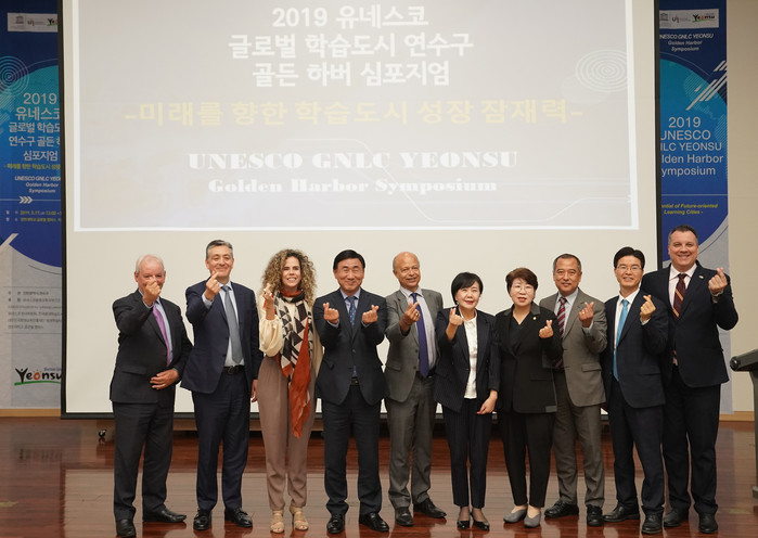 | ▲ 2019 유네스코 글로벌 학습도시 연수구 골든 하버 심포지엄에 참석한 고남석 구청장(왼쪽 네 번째)과 관계자들의 기념촬영 모습. (사진제공=연수구청) |