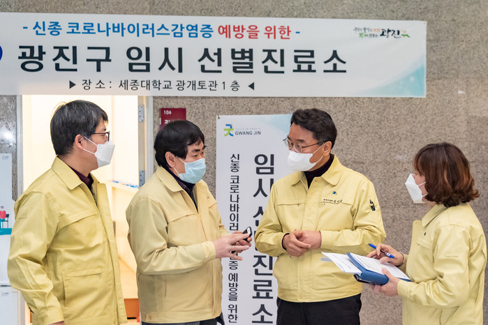 | ▲ 세종대 임시선별진료소에 방문한 김 구청장이 관계자들과 의견을 나누고 있다. |