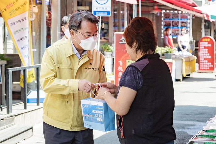 | ▲ 김 구청장이 소상공인에게 자가 실천 꾸러미 전달하고 있다. |
