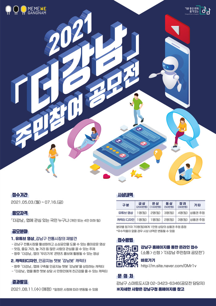 공모는 ‘유튜브 영상’과 ‘캐릭터 디자인’ 2개 분야로 진행된다. 유튜브 영상은 ‘강남구 전통시장의 재발견’을 주제로 지역상권 활성화를 도울 5분 이내 영상을 제작하면 되고, 캐릭터 디자인은 ‘더강남’에 들어갈 인공지능(AI) 챗봇인 ‘강남봇’을 디자인하면 된다.
