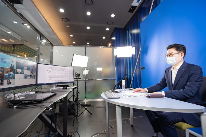 | ▲ 자기주도학습지원센터에서 이정훈 구청장이 e-스튜디오를 통해 13개 고등학교장들과 온라인 화상회의 방식으로 간담회를 진행하고 있다. (사진제공=강동구청) |