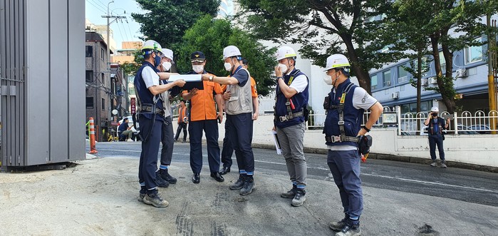 서울 마포소방서가 11일 마포로1구역 제24지구 재개발사업 공사가 진행되는 공사장의 화재취약대상의 화재예방· 안전관리 강화를 위해 건축공사장 현지방문 점검을 실시했다. 사진은 현장을 둘러보며 의논을 하고 있는 관계자들의 모습. (사진제공=마포소방서)